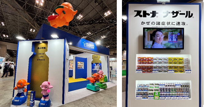 可愛い象さんのマスコット「サトちゃん」が出迎えてくれるのは、佐藤製薬のブースです。 ブースの中では、「ユンケル、ナザール、リングル」をはじめとした主力ブランドを 大きく紹介していました。