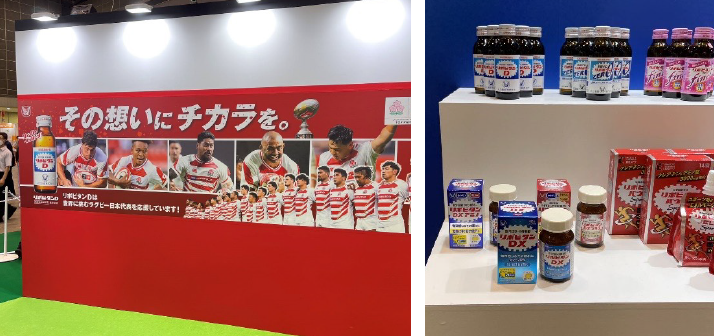 医薬品や化粧品を紹介するブースが多い中で、ラグビー一色のブースがありました。2001年からラグビーの日本代表チームを応援している大正製薬のブースでした。
