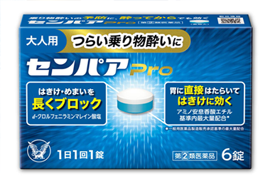 「センパアPro」は、シリーズ最多となる5種類の有効成分を配合し、乗り物酔いによるはきけ・めまいに効果を発揮します。はきけ・めまいを長くブロックするd-クロルフェニラミンマレイン酸塩と、胃に直接働いてはきけに効くアミノ安息香酸エチルを基準内最大配合※しました。