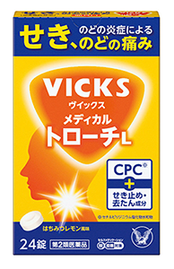 「ヴイックス メディカル トローチL」は、殺菌成分CPC(セチルピリジニウム塩化物水和物)、せき止め成分、去たん成分を配合し、せき、たん、のどの炎症によるのどの痛みなどの症状に効果的なトローチ剤です。